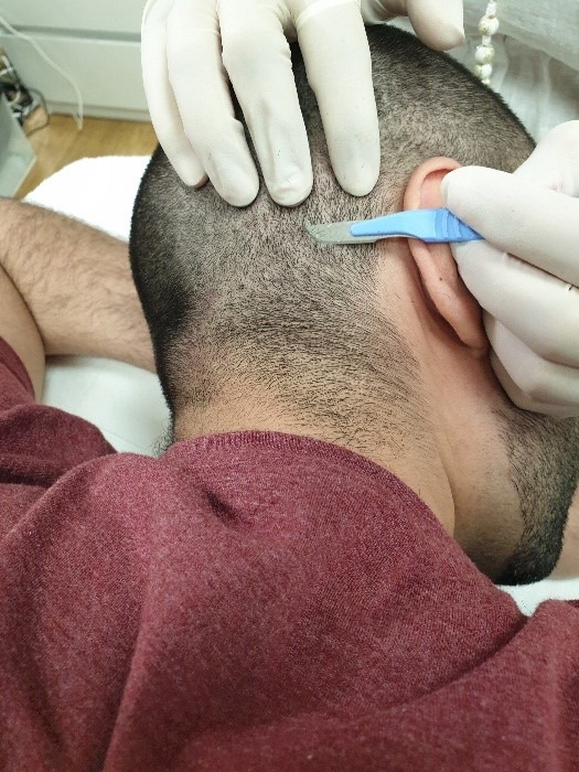 Une nano-découpe simple de quelques microgreffons capillaires est pratiquée sous anesthésie locale, garantissant un processus rapide et confortable.